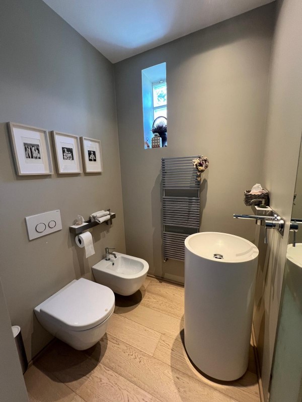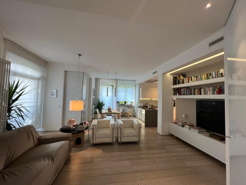 Dotato di 2 bagni, 1 camera matrimoniale, 1 cameretta/studio con cabina armadio, ampia zona giorno e cucina, 4 ripostigli, 3 piccole aiuole in coincidenza dei finestroni. L'appartamento da su una piazzetta con giardino