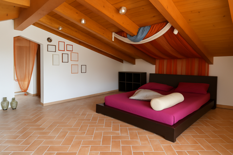 al piano primo abbiamo la zona giorno con l'angolo cottura, la camera da letto matrimoniale, il bagno con la doccia e la finestra e balconi a livello, scala interna che porta al piano superiore dove abbiamo il piano mansardato con il bagno dotato di doccia e finestra di complessi 30 mq