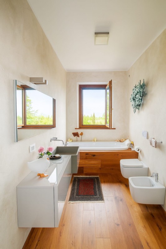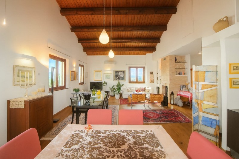 L'abitazione principale si sviluppa al piano primo ed è composta da una spaziosa e luminosa zona giorno di 50 mq suddivisa in cucina e salotto con camino, arricchita da due termoconvettori. La zona notte comprende due camere matrimoniali, una camera singola e doppi servizi finestrati: il primo con doccia e il secondo con vasca idromassaggio. Il tutto impreziosito da un raffinato parquet presente in tutta la casa. Gli infissi sono ad anta-ribalta, completi di zanzariere. La dependance, accogliente e funzionale, si compone di ampia zona giorno con angolo cottura, camera matrimoniale, ripostiglio e bagno con doccia e finestra