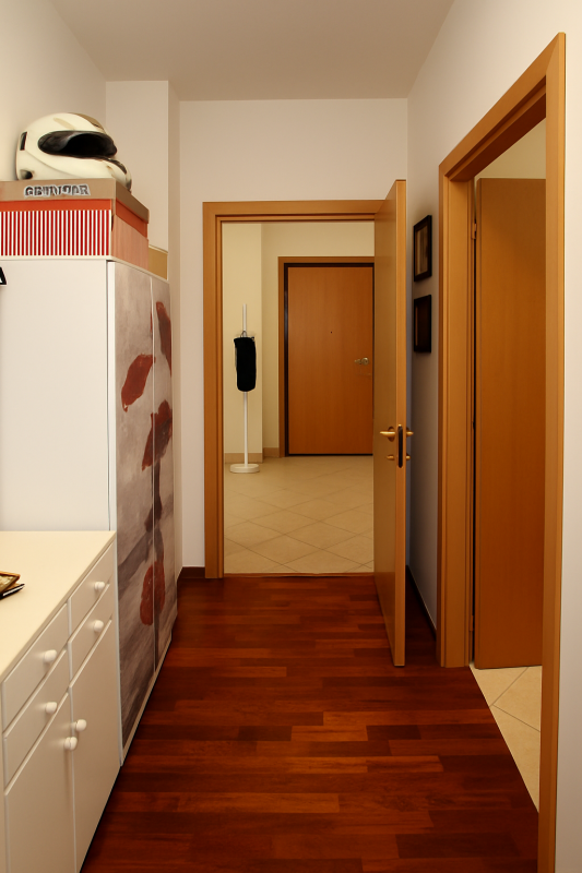 è composto da ingresso su ampia zona giorno con salone da un lato e cucina abitabile dall'altro, entrambi con accesso ai due balconi loggiati; segue un comodo disimpegno che conduce a due spaziose camere matrimoniali, al bagno principale finestrato con vasca e al secondo bagno con aspiratore e doccia. La proprietà viene venduta priva di mobilia ed è completata da due garage esclusivi interrati di 18 mq ciascuno